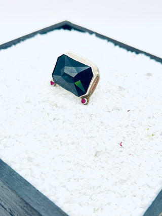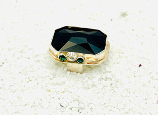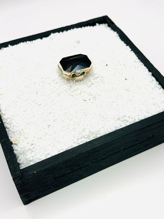 Sterling Silver Ring | Black Emerald-Cut Preciosa Crystal & Green Accents | Size 4 | Modern Boho Statement Jewelry